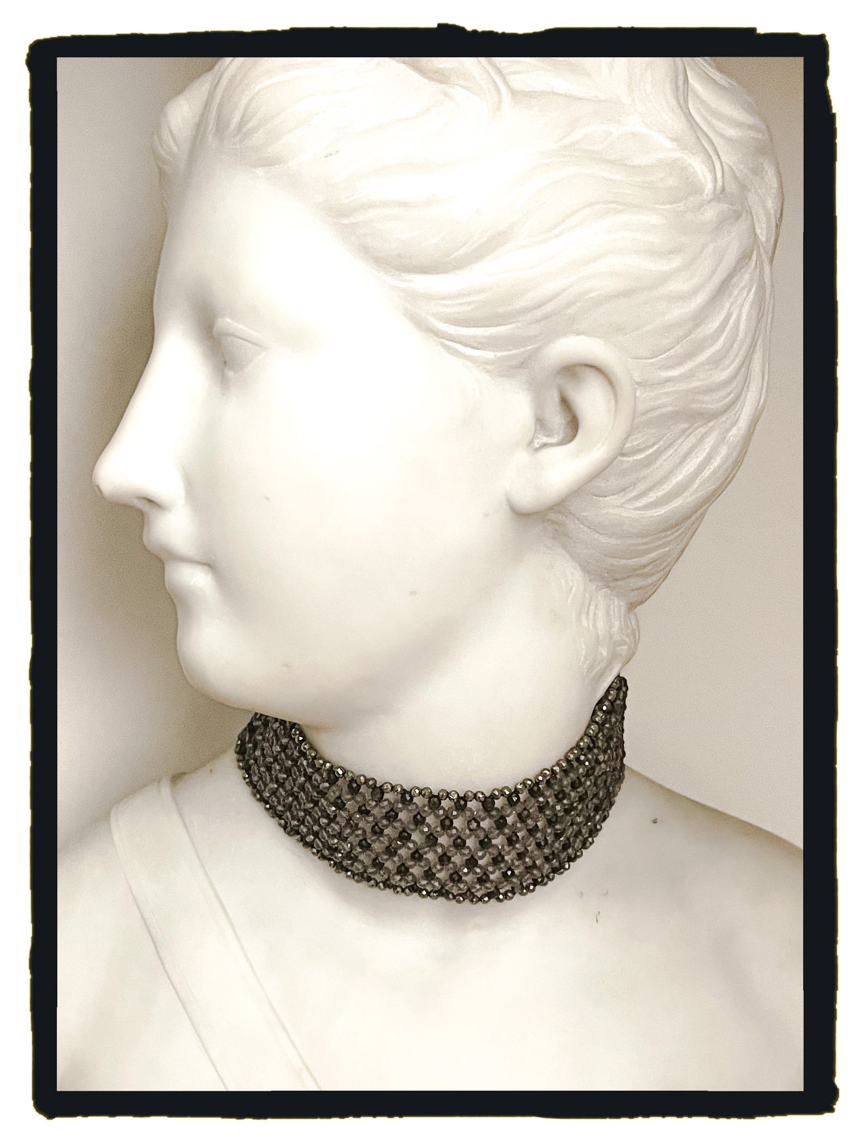 Choker realizado artesanalmente con obsidiana, cuarzo ahumado, pirita y cierre de acero dorado.