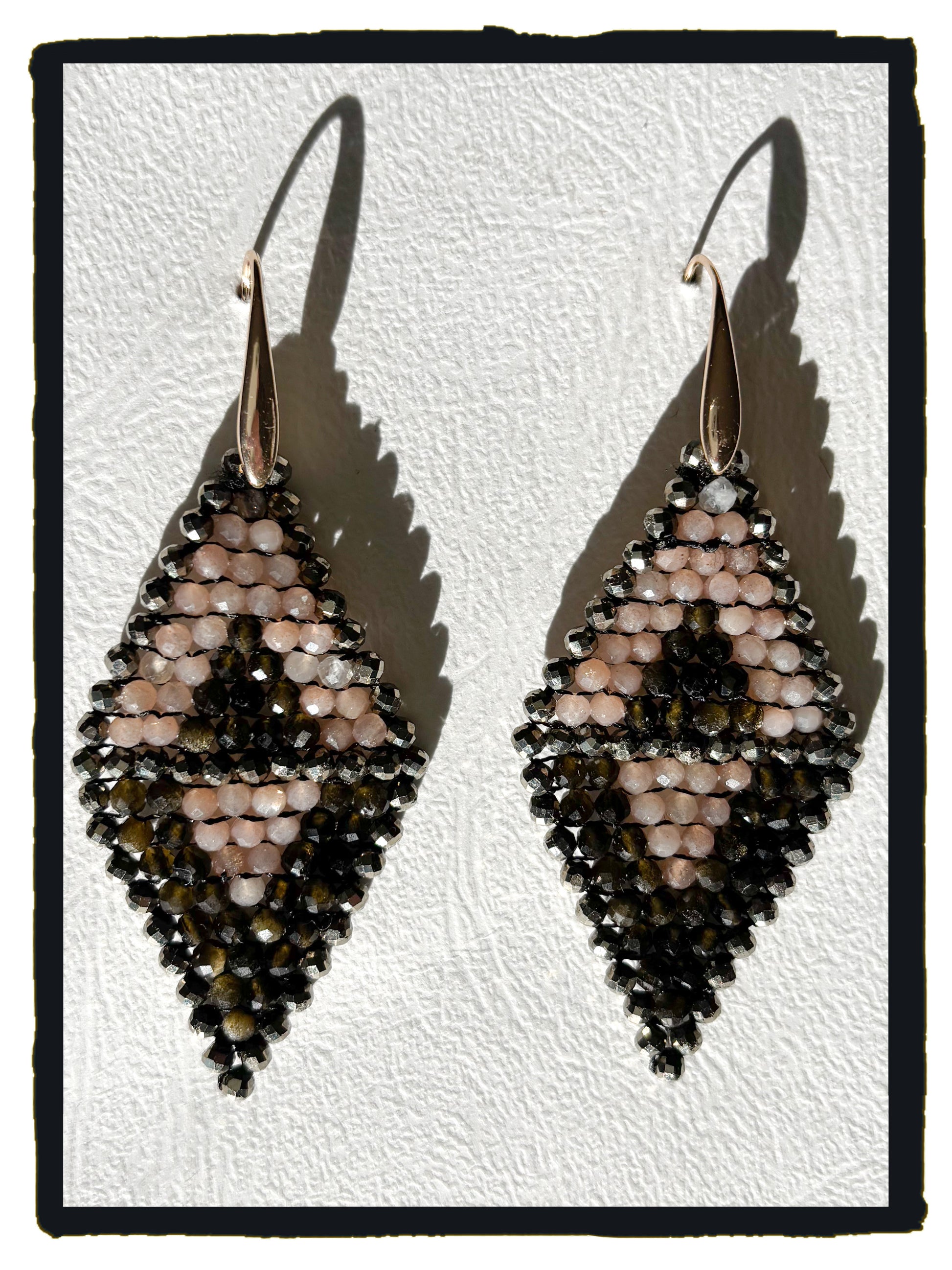 Pendientes realizados artesanalmente con piedra sol, obsidiana, pirita y ganchos de latón bañados en oro.