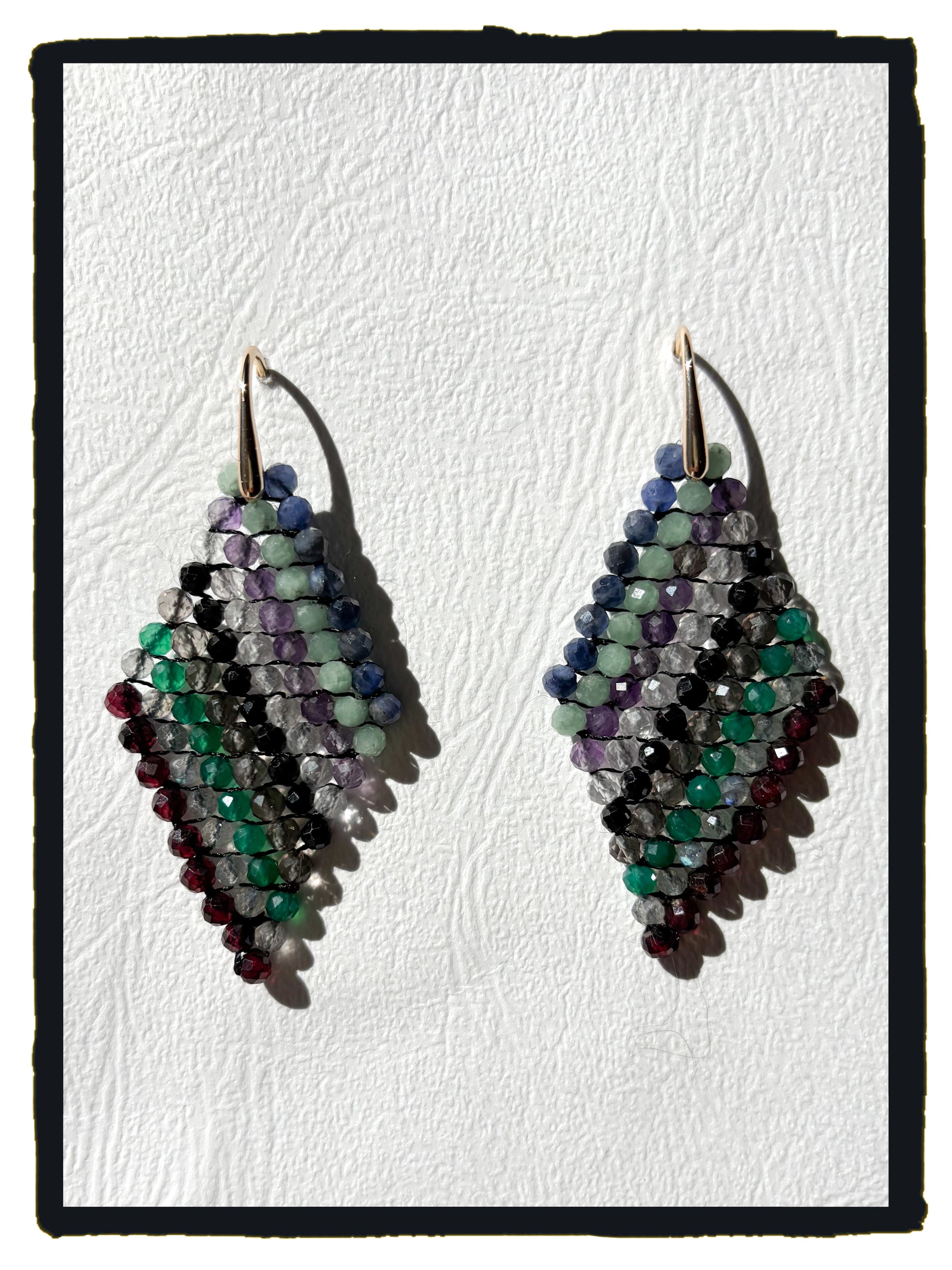 Pendientes realizados artesanalmente con granates, topacios, amatista, ágatas, turmalina, labradorita, cuarzo ahumado y ganchos de latón bañados en oro.